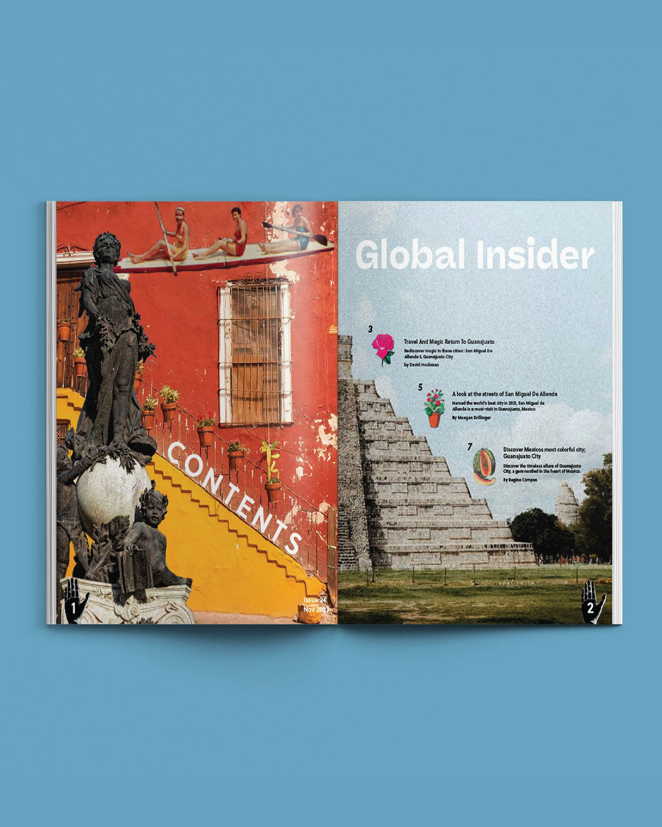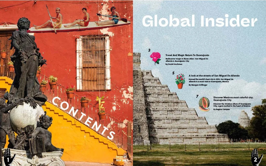 Global Insider is a travel magazine all about Mexico. The design celebrates Mexico’s cities, history, and magic through collage and loteria symbols that feel both nostalgic and at home. By presenting landmarks and cultural symbols in a playful way, the design sparks curiosity and invites readers to imagine themselves experiencing these places firsthand.